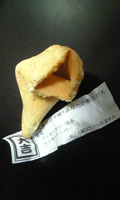 画像は昨日食べたおみくじクッキー(ふぉーちゅーんクッキーみたいだ!)。見事に大吉でした。やったね(´ω`)